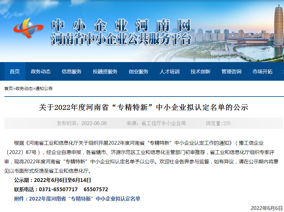近日,河南省中小企業(yè)公共服務(wù)平臺(tái)對2022年度河南省“專精特新”中小企業(yè)擬認(rèn)定名單進(jìn)行公示。