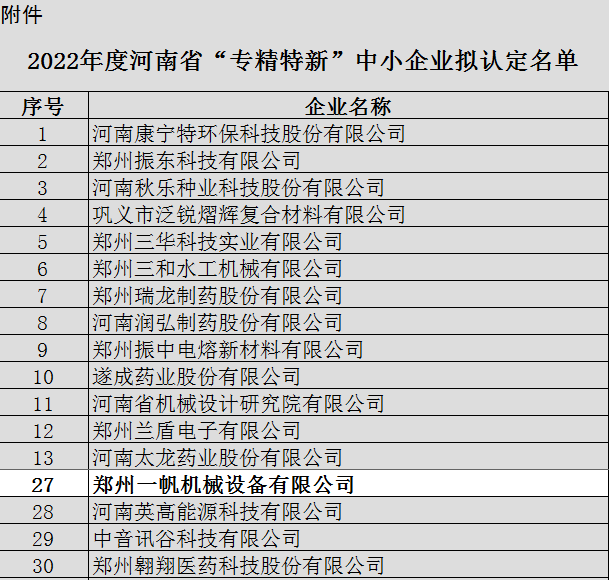 根據(jù)《河南省工業(yè)和信息化廳關(guān)于組織開展2022年度河南省“專精特新”中小企業(yè)認(rèn)定工作的通知》,經(jīng)企業(yè)自愿申報(bào),各地工業(yè)和信息化主管部門初審?fù)扑],省工業(yè)和信息化廳組織專家評審認(rèn)定,鄭州一帆機(jī)械設(shè)備有限公司憑借專業(yè)的技術(shù)與研發(fā)能力成功入選2022年度河南省“專精特新”企業(yè)名單。
